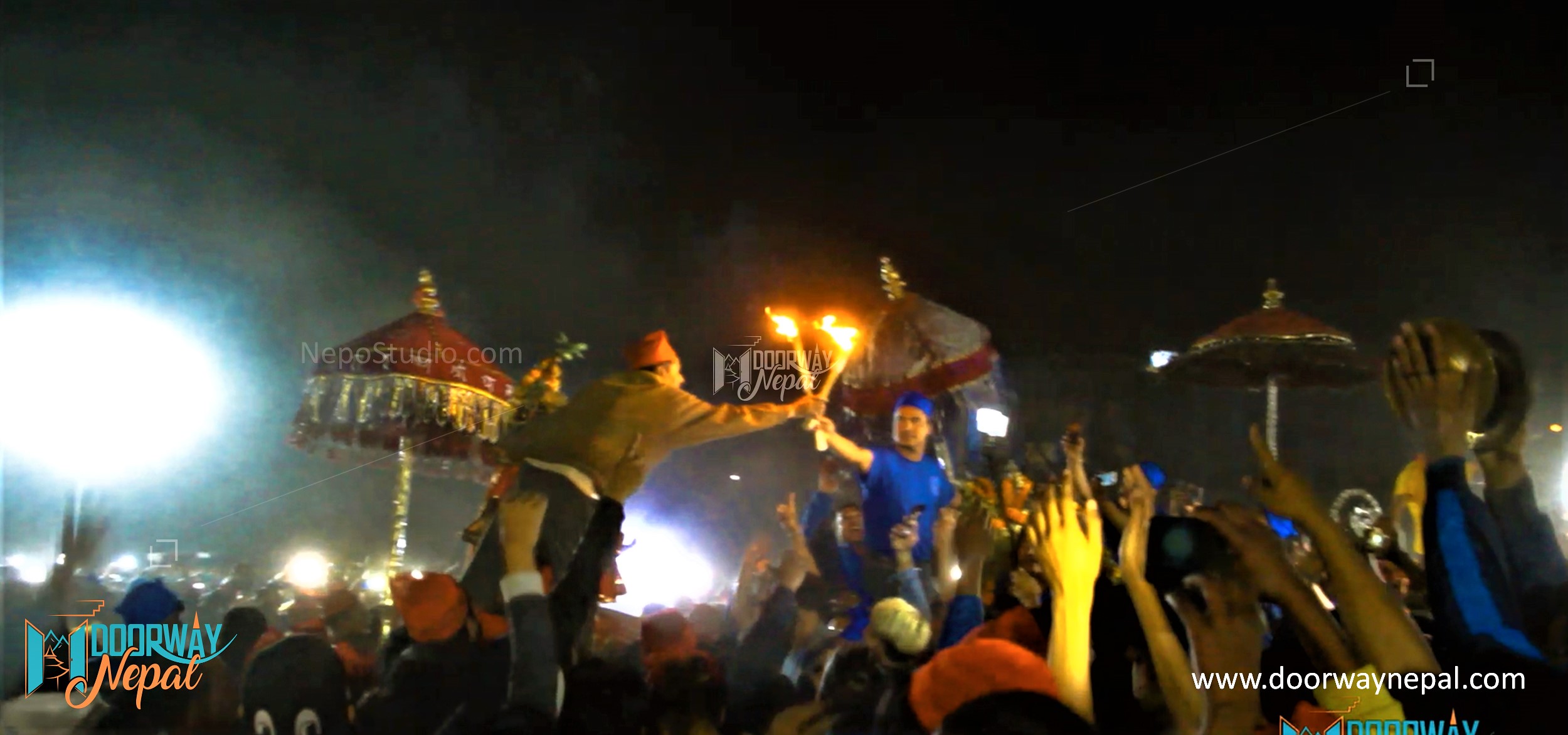 Later at night, they are carried on the shoulders of their attendants and assembled at Tundikhel accompanied by the musical bands. Then a ceremony is held when the entourages accompanying them exchange flaming torches symbolizing the meeting of the goddesses.